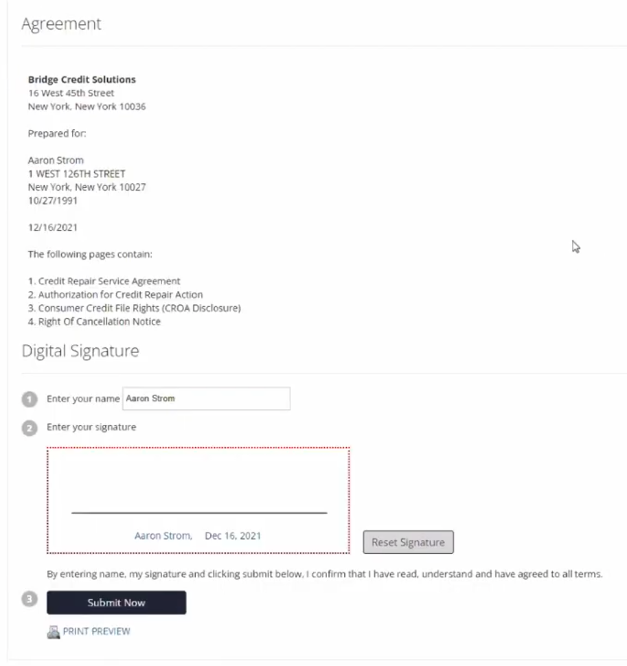 We will instruct the client to place their signature in the box down below and click Submit Now.